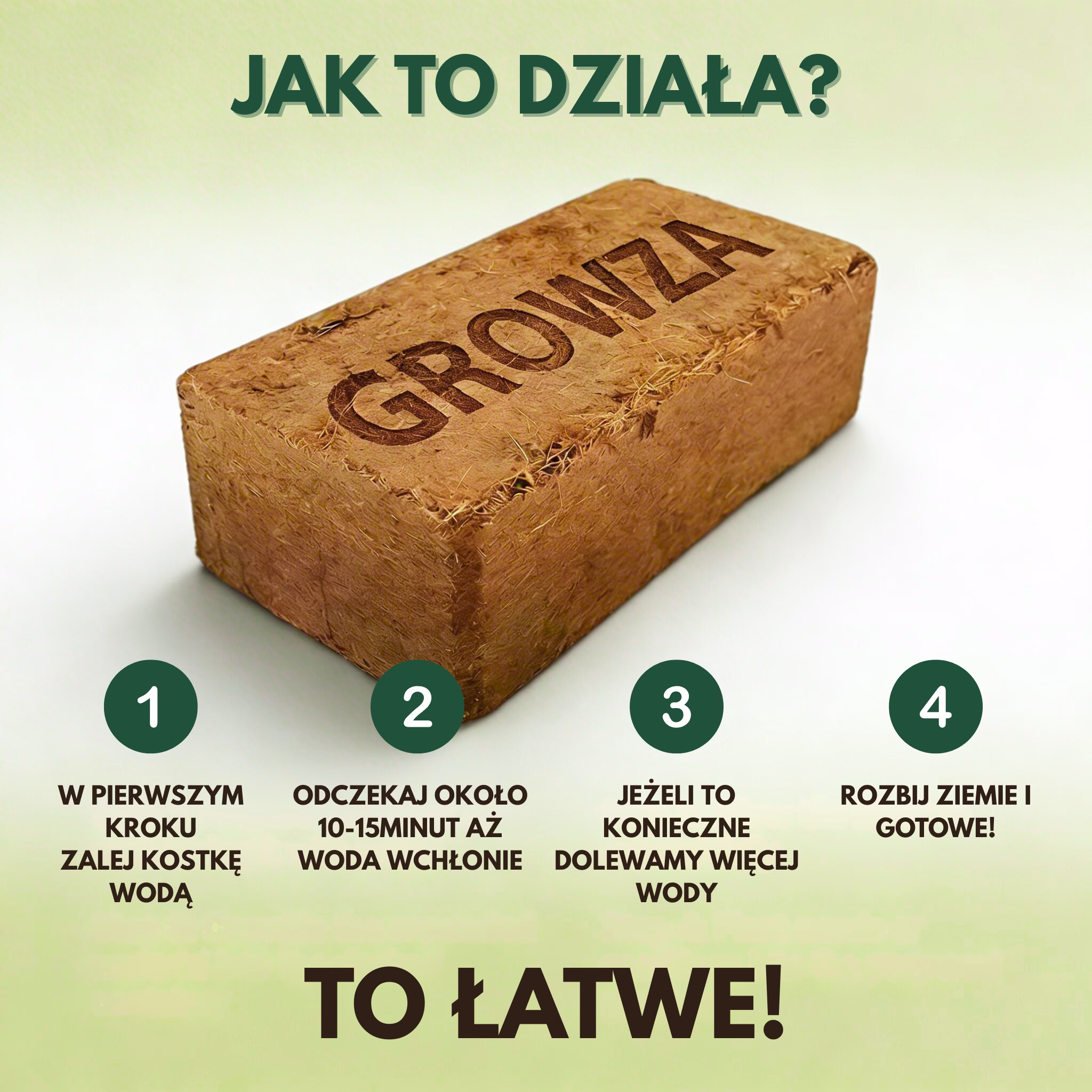Jeden sprasowany blok Growza po zalaniu wodą rozpręża sie i zamienia w lekkie, puszyste podłoże.